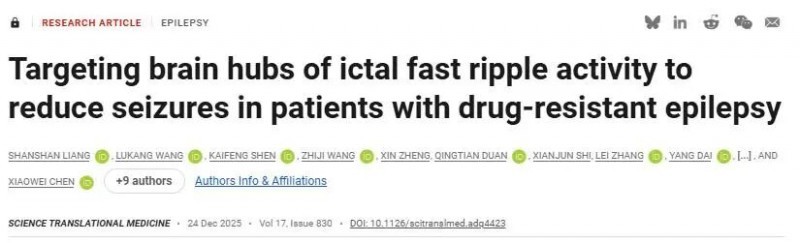 研究团队构建癫痫相关的功能网络图谱,成功识别出每个患者大脑中独特的个体化“FR网络关键节点”,为安全有效的神经刺激提供了理想靶点,从根本上推动了癫痫治疗范式从针对局部“病灶”的切除,升级为针对全脑“异常网络”的个性化精准调控;从固定靶点的“一刀切”,发展为“量体裁衣”式的个体化方案。《Science Translational Medicine》给予了高度评价:“丘脑前核是美国FDA唯一批准的癫痫深部脑刺激的治疗靶点,全球科学家仍在努力探索精准的个性化靶点。此项突破性研究,通过解码患者颅内脑电图信号(SEEG),首次提出癫痫大脑高频振荡网络的关键节点,这些节点为癫痫个性化神经调控治疗开辟全新路径,突破FDA现有靶点局限。”