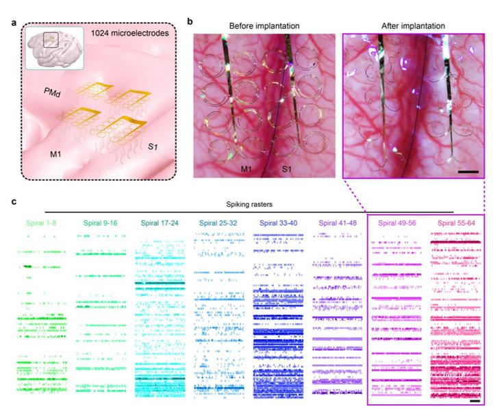 植入1024通道的可拉伸柔性电极后,大脑中的神经元活动记录。